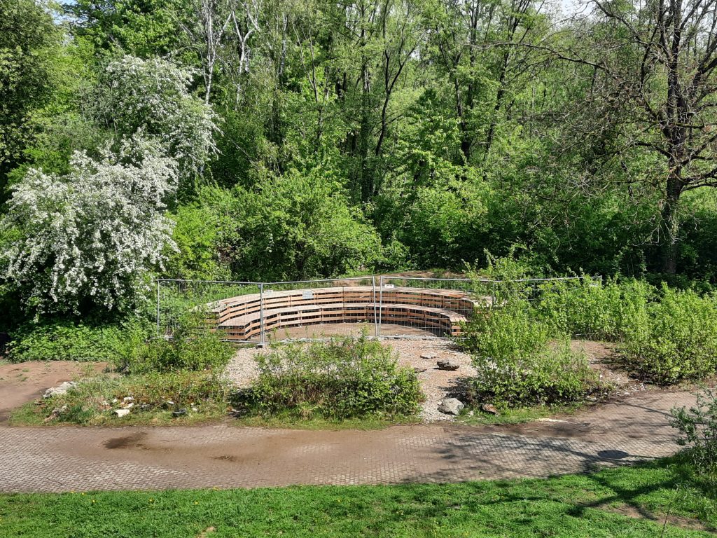 Nach den Ferien konnte man eine deutliche Veränderung erkennen. Zwar nicht beim Bau aber von der Umgebung. Die Bäume strahlen in schönen Grüntönen.
