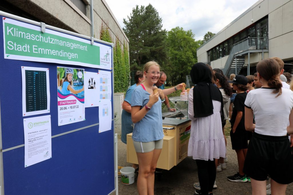 Das Eis hatte die Stadt für das GGE als Sieger im diesjährigen Stadtradeln gespendet. Mit großem Abstand konnte das GGE den Wettbewerb für sich entscheiden: Mit insgesamt 39 017 km, die 195 Radelnde einfuhren, belegte das GGE den ersten Platz. Darunter erradelten Jonas Beck (1327,2 km) und Lisa Koch (1005 km) von Schülerseite die meisten Kilometer. Von Elternseite kamen 5089,1 km zusammen. Die Mitarbeitenden/Lehrenden fuhren 3082,1 km ein. Die stärkste Klasse war die Klasse 5a als „Die rasenden Radler“ mit 3453,8 km.