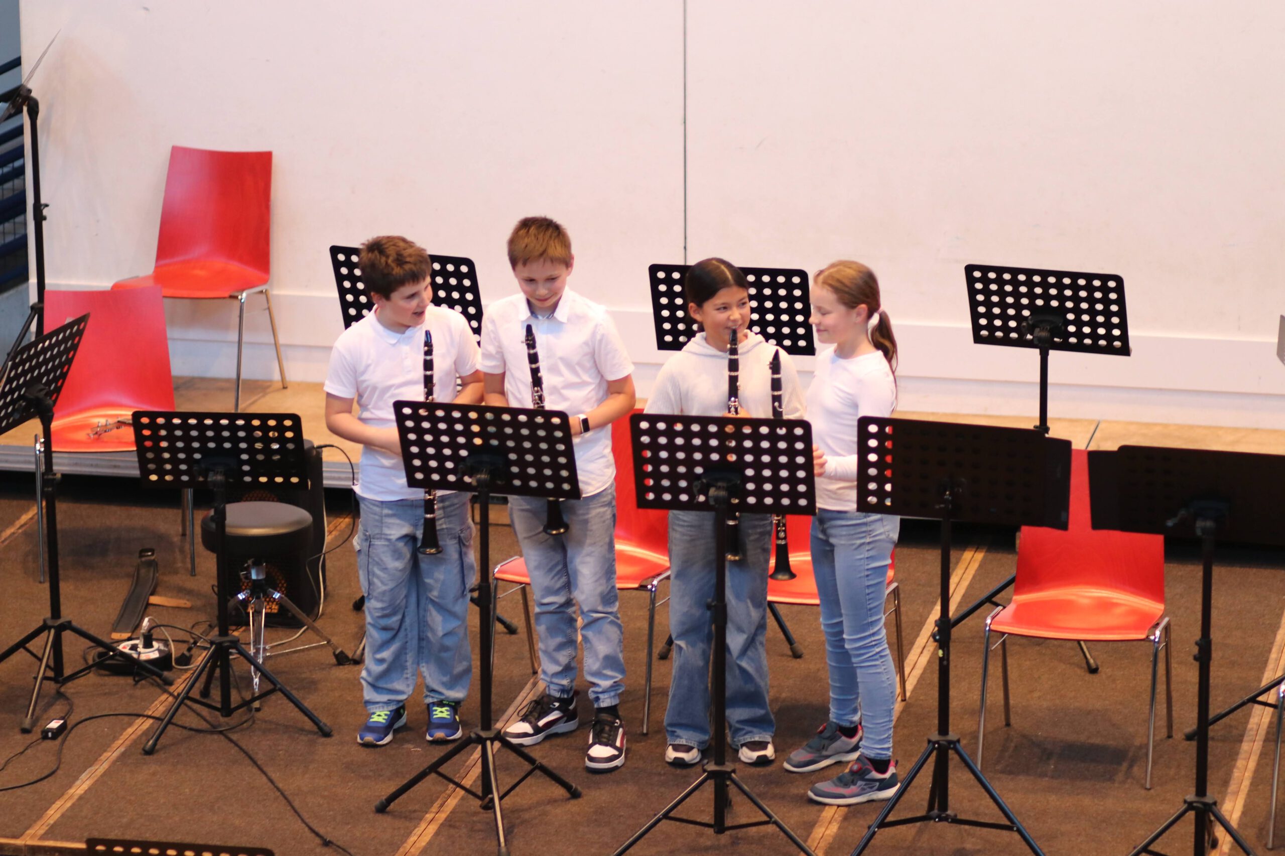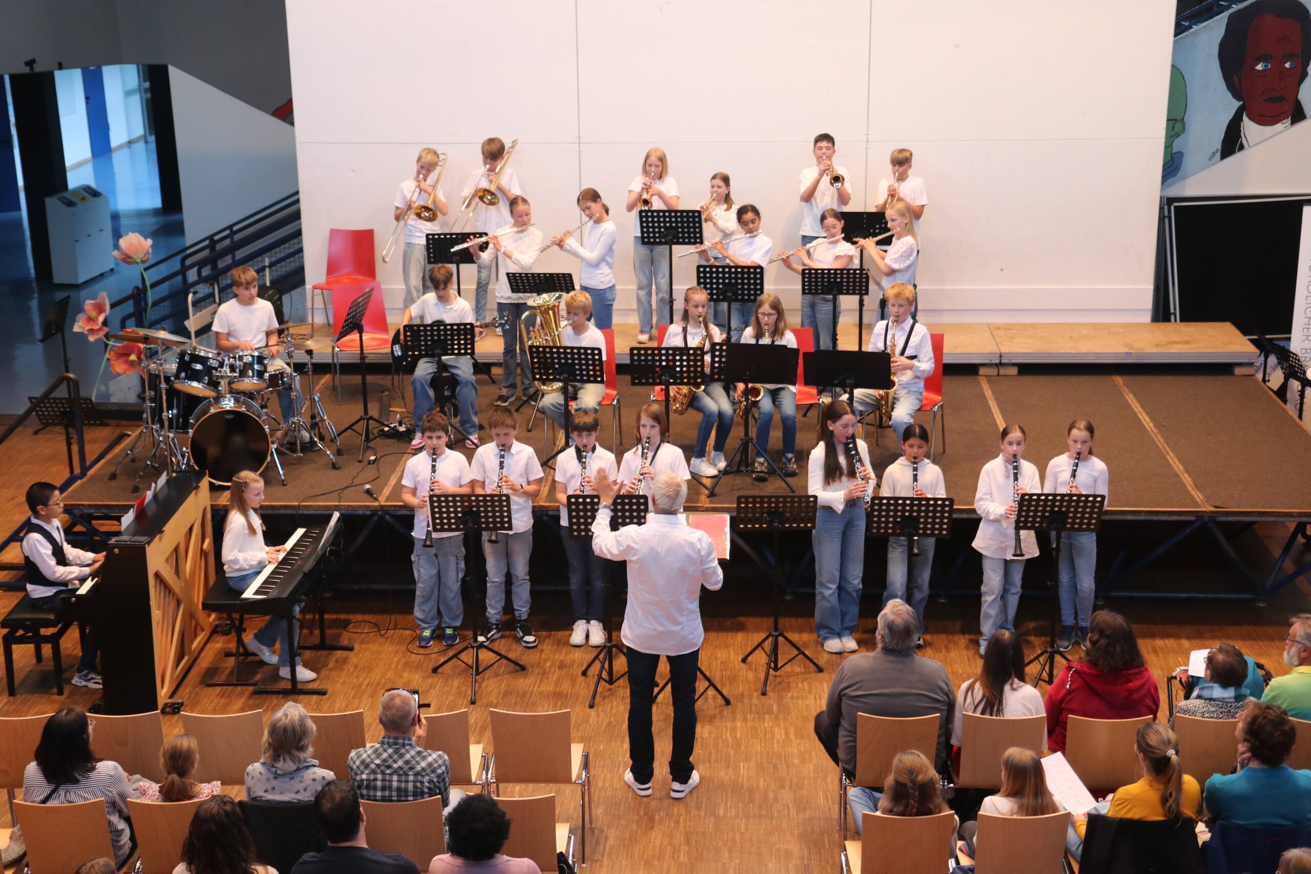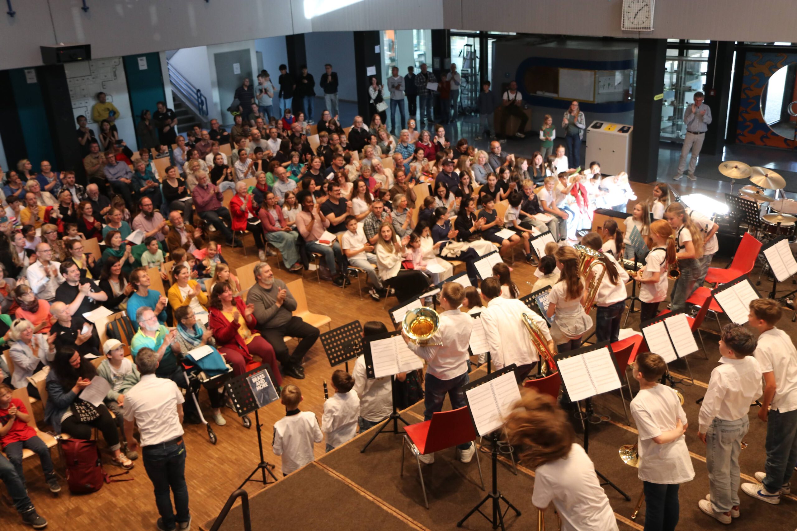 Angefangen mit der Bläserklasse 5, die ein buntes Programm aus französischen und englischen Volksliedern präsentierte, gefolgt von der Bläserklasse 6, die mit ihren jeweiligen Kleingruppen konzertierte und abgerundet durch die Bläserklasse 7, die schwungvollen Beatles-Arrangements darbot, musizierten verschiedene Ensembles der Musikschule verteilt im Raum, sodass die GGE-Aula von allen Seiten beschallt wurde.