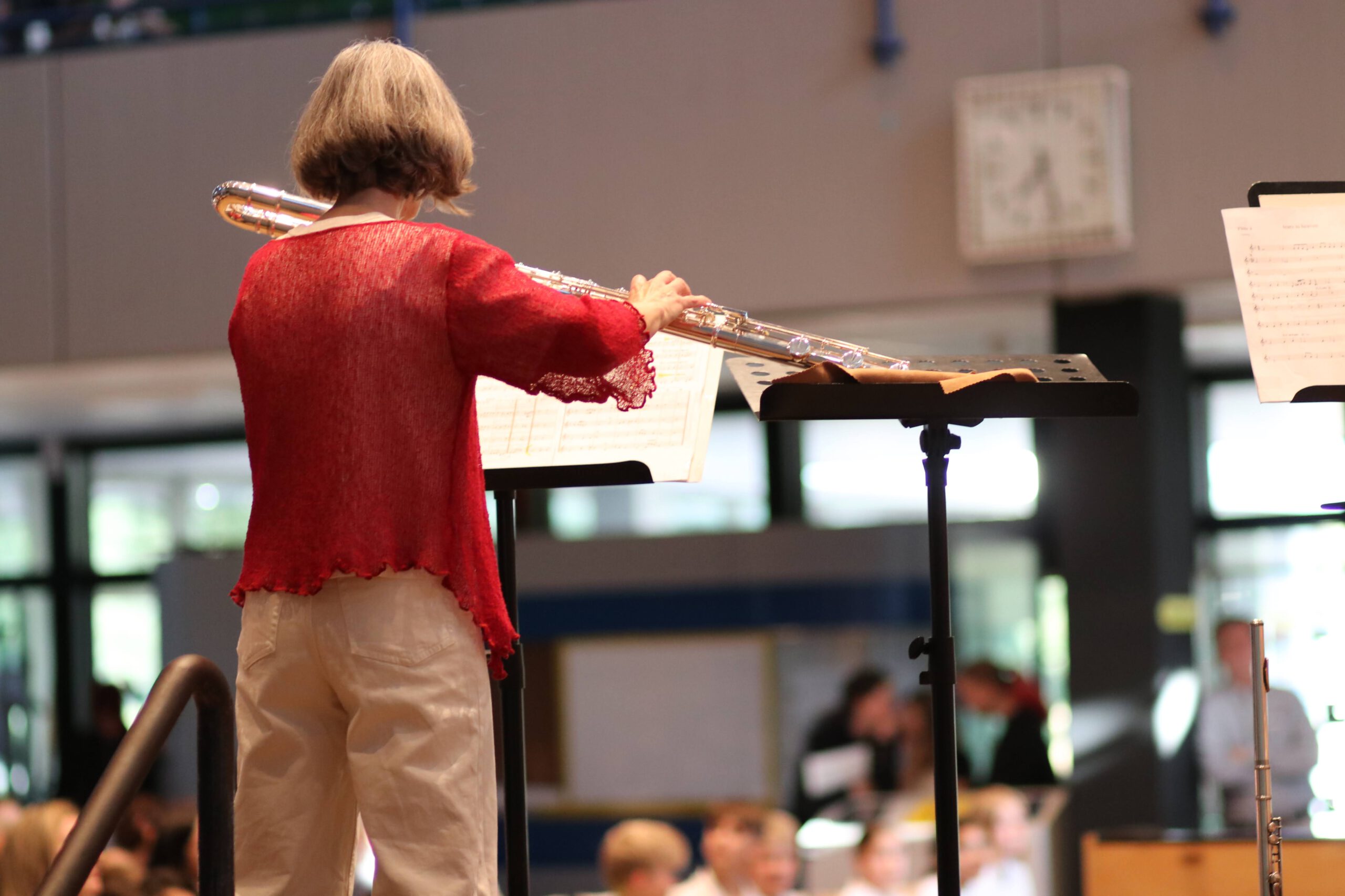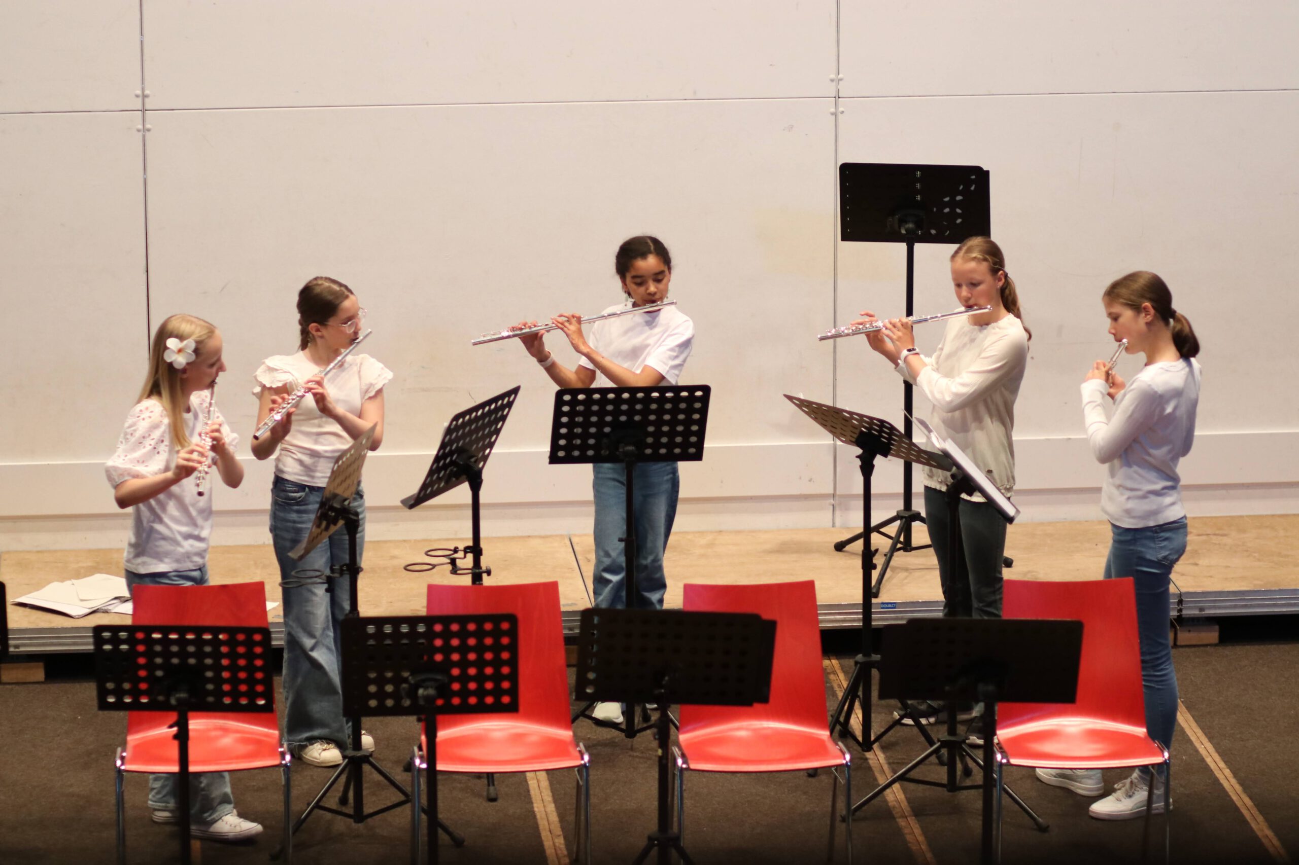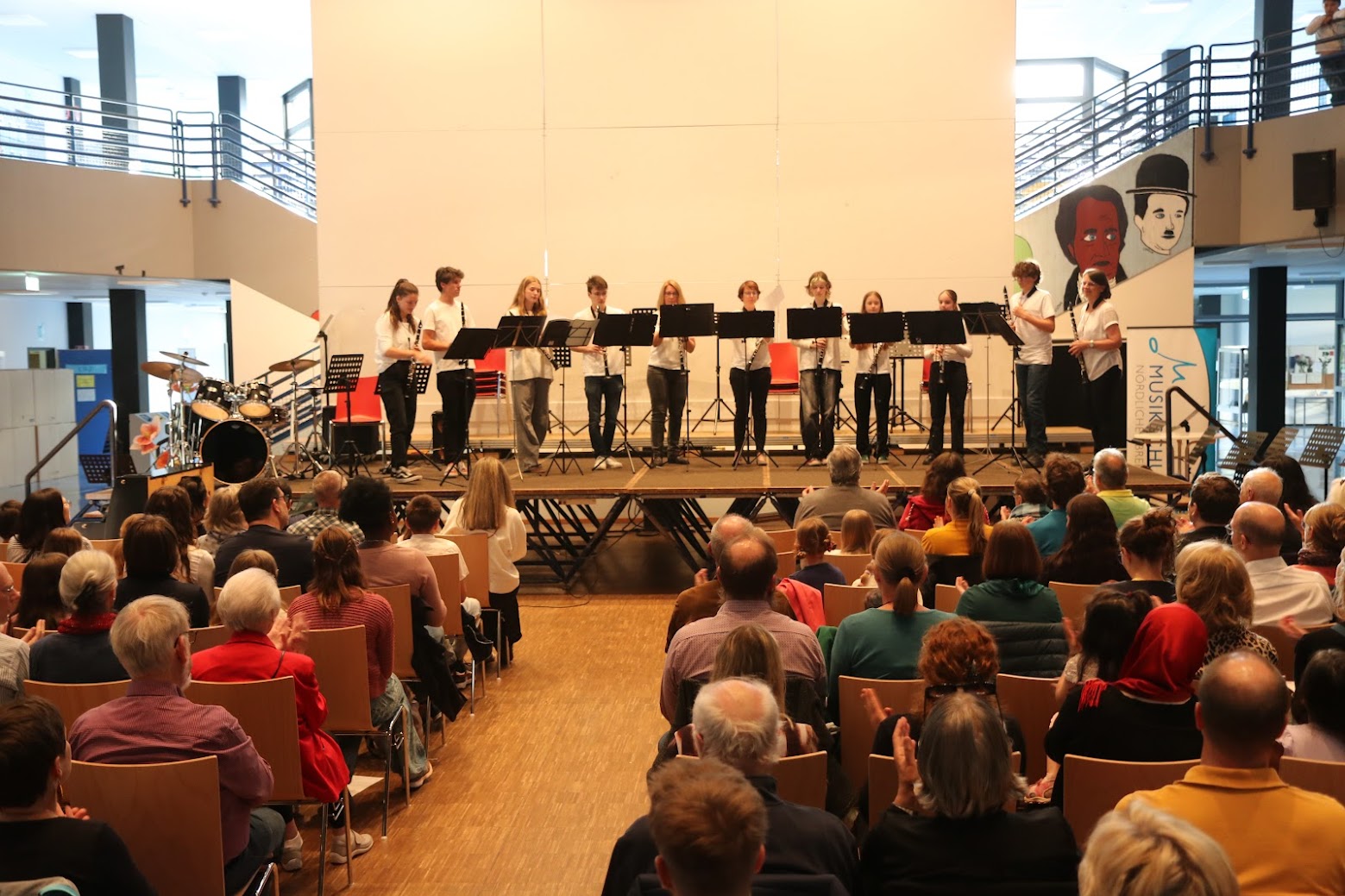 Angefangen mit der Bläserklasse 5, die ein buntes Programm aus französischen und englischen Volksliedern präsentierte, gefolgt von der Bläserklasse 6, die mit ihren jeweiligen Kleingruppen konzertierte und abgerundet durch die Bläserklasse 7, die schwungvollen Beatles-Arrangements darbot, musizierten verschiedene Ensembles der Musikschule verteilt im Raum, sodass die GGE-Aula von allen Seiten beschallt wurde.