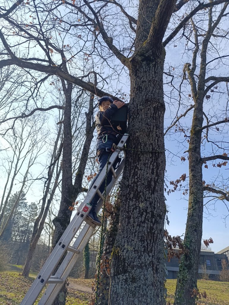 Rund ums Schulhaus hat die Natur-AG, unter fachkundiger Anleitung und gut gesichert, Nistkästen aufgehängt.